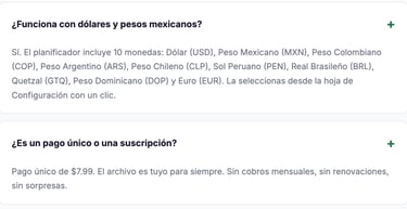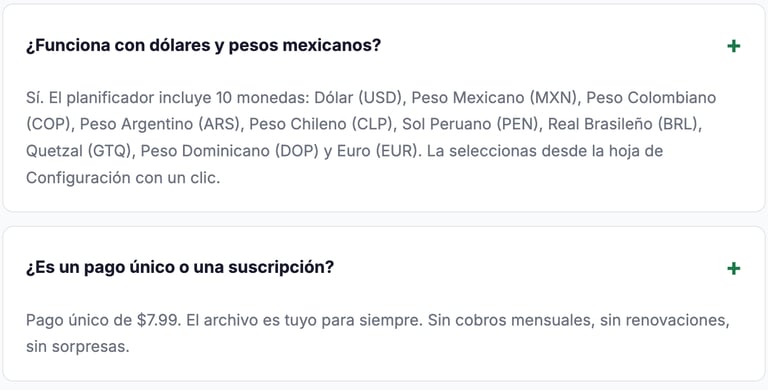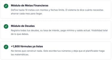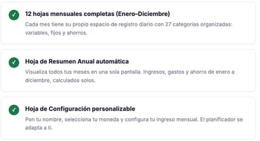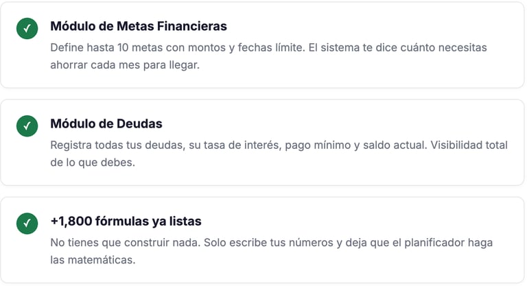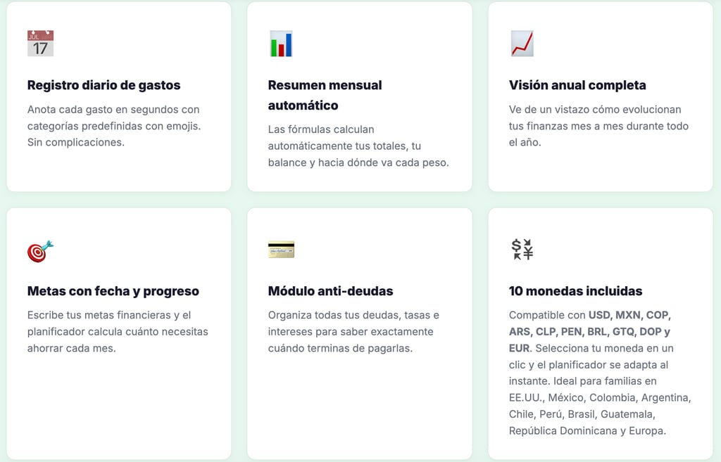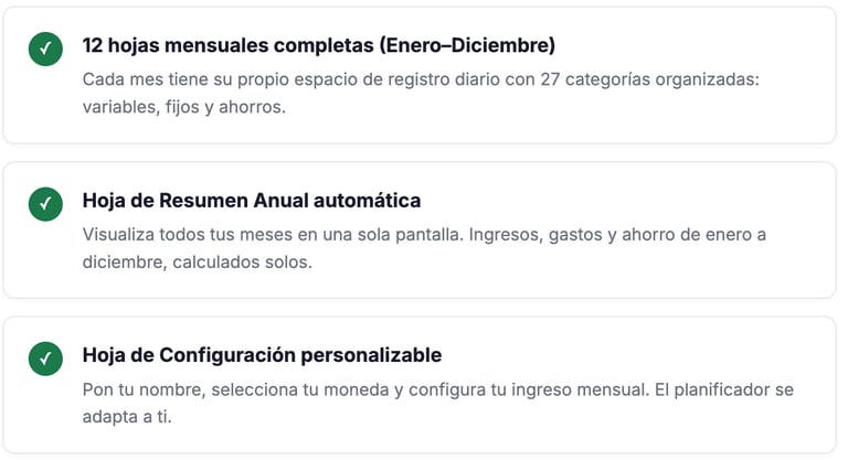 📅 12 hojas mensuales 📊 Resumen anual automático 🎯 Hoja de metas 💳 Módulo de deudas 💱 +10 Monedas ⚡ +1,800 fórmulas listas